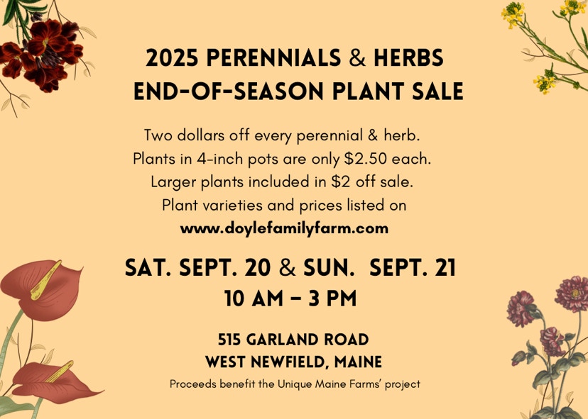 The Doyle Family Farm at 515 Garland Road in West Newfield, Maine, will be welcoming visitors on Saturday, September 20 & Sunday, September 21, from 10 a.m. to 3 p.m. for their Two-Dollar Off Every Perennial and Herb End-of-the-Season Fall Sale. Fall is a perfect time to plant perennials. Perennials and Herbs in 4-inch pots will be on sale for $2.50 each. Plants in larger pots will be reduced by two dollars each. Proceeds from the sale benefit the Unique Maine Farms project. Signed copies of the Unique Maine Farms book will also be available for sale. A listing of the available perennials and herbs can be found at the link below.